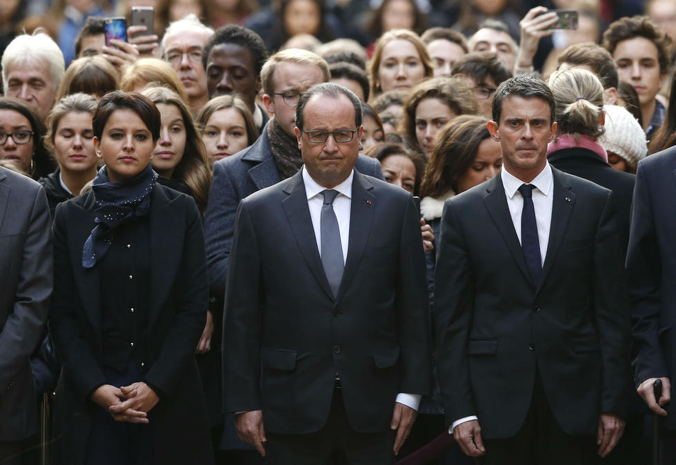 当地时间11月16日,法国民众默哀一分钟,悼念巴黎恐袭遇难者。图为法国总统奥朗德参加默哀仪式。 (来自:腾讯图片)