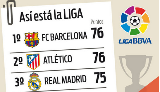 腾讯体育4月18日讯 五大联赛最大冠军悬念,最惨烈争冠大战,就在西甲!第33轮,巴萨主场翻船,马德里双雄齐奏凯歌,西甲争冠格局空前激烈,前3名之间只差1分,巴萨马竞同为76分,皇马75分。